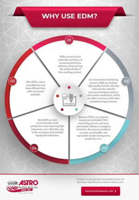 The EDM process is most commonly used to manufacture parts and components for the automotive, aerospace, and electronics industries.